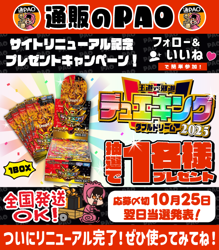 ただいま通販のPAO公式Xでは「デュエル・マスターズ 王道vs邪道 デュエキングWDreaM 2025」1BOXが抽選で1名様に当たる!
